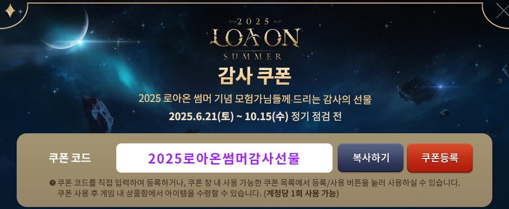 2025년 로아온 썸머이벤트 기념 감사 쿠폰 입니다.